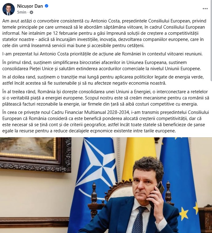 În final, Nicușor Dan a menționat că i-a transmis președintelui Consiliului European că, în ceea ce privește noul Cadru Financiar Multianual 2028-2034, România consideră ca este benefică ponderea alocată creșterii competitivității, însă consideră necesar să se țină cont și de criterii geografice: ”În ceea ce privește noul Cadru Financiar Multianual 2028-2034, i-am transmis președintelui Consiliului European că România consideră ca este benefică ponderea alocată creșterii competitivității, dar că este necesar să se țină cont și de criterii geografice, astfel încât toate statele să beneficieze de șanse egale la resurse pentru a reduce decalajele ecpnomice existente intre tarile europene”, a transmis Nicușor Dan.