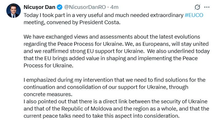 „Astăzi am participat la o reuniune extraordinară #EUCO, foarte utilă și mult necesară, convocată de președintele Costa. Am făcut schimb de opinii și evaluări cu privire la cele mai recente evoluții privind procesul de pace pentru Ucraina. Noi, ca europeni, vom rămâne uniți și am reafirmat sprijinul puternic al UE pentru Ucraina. De asemenea, am subliniat astăzi că UE aduce o valoare adăugată în conturarea și implementarea procesului de pace pentru Ucraina. Am subliniat în timpul intervenției mele că trebuie să găsim soluții pentru continuarea și consolidarea sprijinului nostru pentru Ucraina, prin măsuri concrete. Am subliniat, de asemenea, că există o legătură directă între securitatea Ucrainei și cea a Republicii Moldova și a regiunii în ansamblu și că actualele negocieri de pace trebuie să ia în considerare acest aspect” a declarat președintele României, Nicușor Dan.