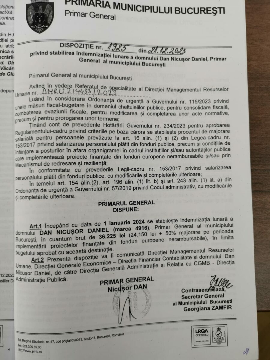 Începând cu data de 1 ianuarie 2024, se stabilește indemnizația lunară a domnului Nicușor Dan Daniel, primar general al Municipiului București, în cuantum brut de 36.225 lei (24.150 lei + 50% majorare pe perioada implementării proiectelor finanțate din fonduri europene nerambursabile), în limita bugetului aprobat cu această destinație”, scrie în dispoziția semnată de edilul Nicușor Dan și contrasemnată de secretarul general al Capitalei, Georgiana Zamfir.