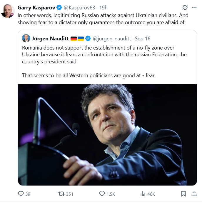 „Cu alte cuvinte, legitimarea atacurilor rusești împotriva civililor ucraineni. Iar a-ți arăta frica față de un dictator nu face decât să garanteze rezultatul de care te temi”, a scris Gary Kasparov pe rețeaua X.