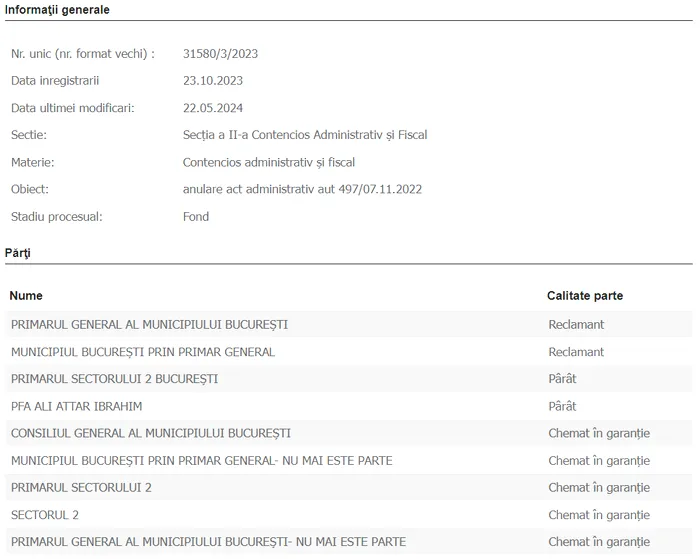 „Tip soluție: Respinge cererea. Soluția pe scurt: Admite excepţia lipsei calităţii procesuale active a reclamanţilor, invocată de pârâţi. Respinge integral cererea de chemare în judecată formulată de reclamanţii MUNICIPIUL BUCUREŞTI şi PRIMARUL GENERAL AL MUNICIPIULUI BUCUREŞTI, în contradictoriu cu pârâţii SECTORUL 2 BUCUREŞTI, PRIMARUL SECTORULUI 2 BUCUREŞTI şi PFA ALI ATTAR IBRAHIM, ca fiind introdusă de persoane fără calitate procesuală activă.