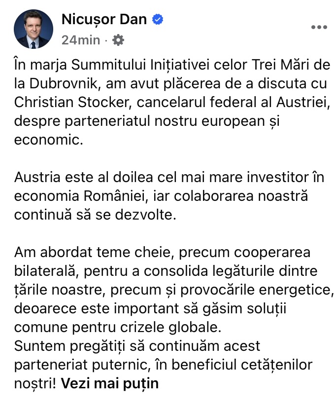 „În marja Summitului Inițiativei celor Trei Mări de la Dubrovnik, am avut plăcerea de a discuta cu Christian Stocker, cancelarul federal al Austriei, despre parteneriatul nostru european și economic.