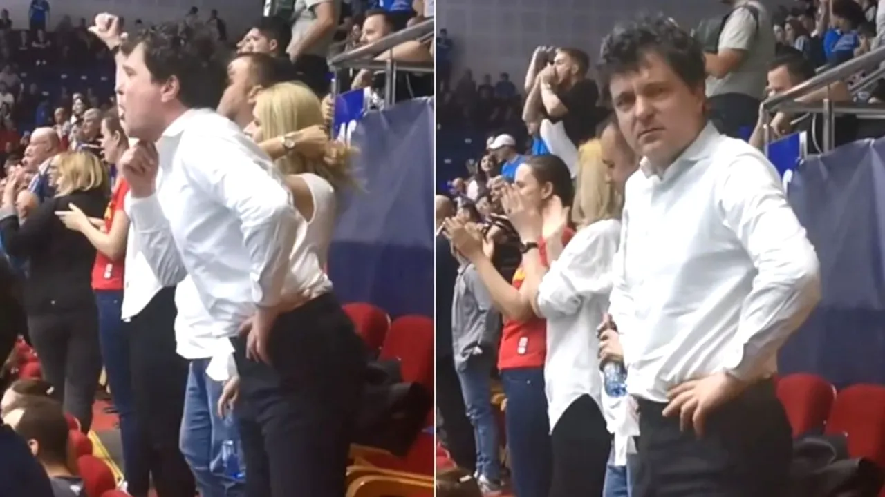În imaginile publicate pe pagina de Facebook a publicaţiei ştiripesurse.ro se poate observa cum Nicuşor Dan huiduie, timp de câteva zeci de secunde, la finalul meciului dintre CSM Bucureşti şi Esbjerg, în manşa secundă a sferturilor de finală.