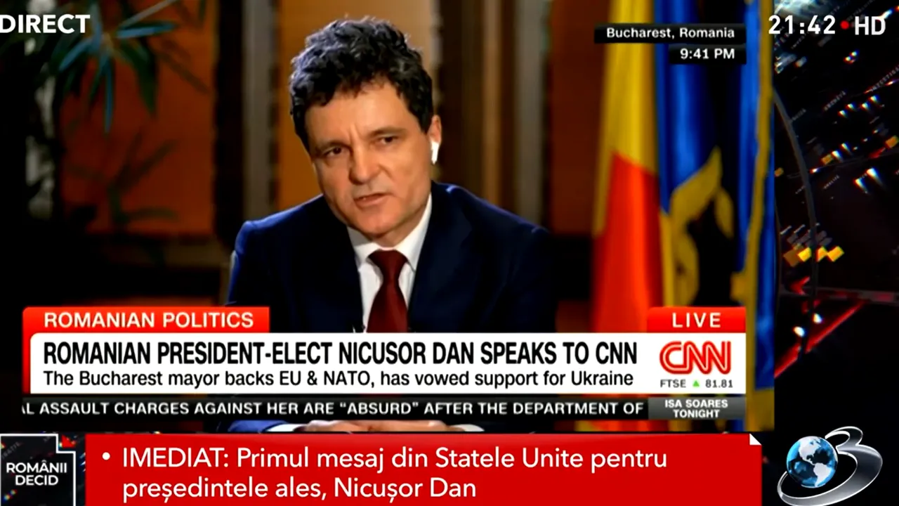 Președintele ales al României, la alegerile din 18 mai 2025, Nicușor Dan, a oferit în această seară primul său interviu la o televiziune internațională, după câștigarea alegerilor. El a discutat cu jurnalistul Max Foster, de la CNN.