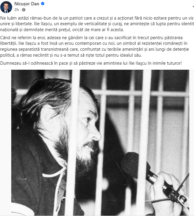 Într-un mesaj postat pe contul său de Facebook, Nicușor Dan îi aduce un omagiu fostului deținut politic din Republica Moldova, un luptător pentru independența țării sale și un susținător convins al unirii României cu Basarabia.