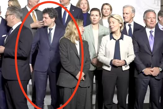 Poziționarea lui Nicușor Dan pe podium este lângă premierul Danemarcei, Mette Frederiksen, cu care nici nu vorbește, și în spatele Giorgiei Meloni, premierul Italiei, și Ursulei von Der Leyen, șefa Comisiei Europene, care glumesc, râd și se gratulează reciproc.
