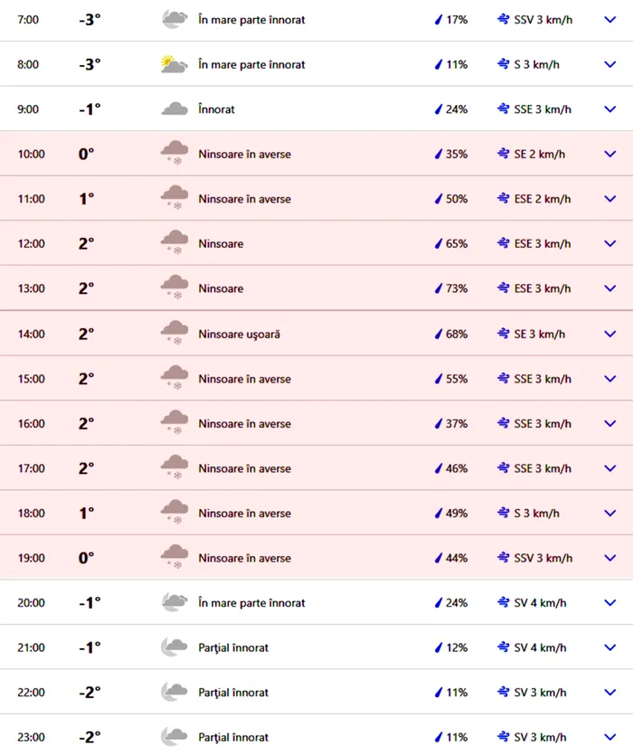 • 10:00 – temperatura atinge 0 grade, ninsoare în averse, umiditatea ajunge la 35%;