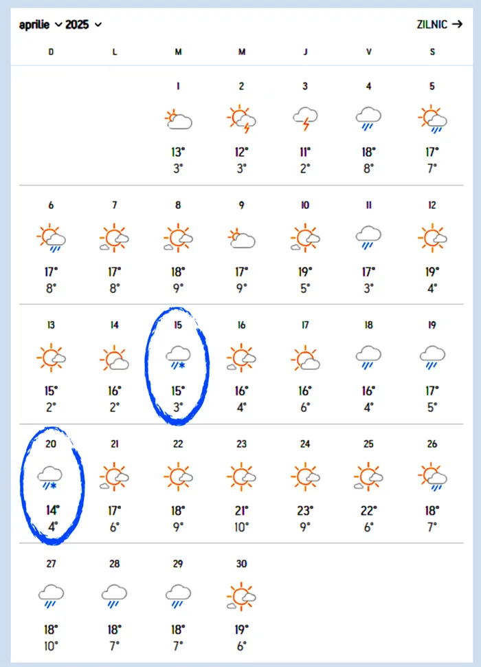 - 15 aprilie 2025, București: se vor înregistra precipitații sub formă de lapoviță și ninsoare. Temperatura maximă va fi de 15 grade, iar cea minimă va coborî până la 3 grade.
