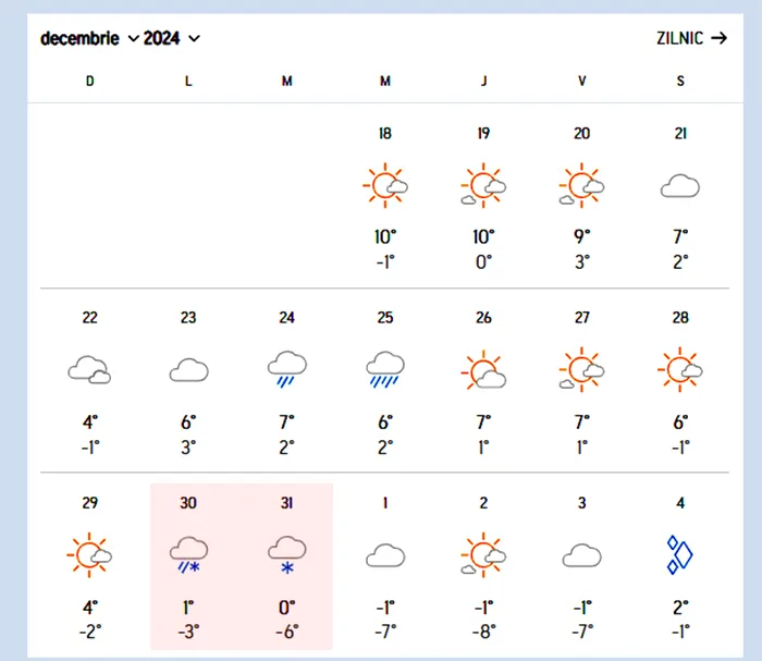 Mai exact, tocmai sfârșitul anului ne va răsfăța cu fulgii de nea mult așteptați, pentru a completa tabloul unei ierni de poveste. Astfel, în 30 decembrie vom avea o maximă de 1 grad și minimă de minus 3 grade, iar în ultima zi a anului vom înregistra temperaturi de 0, respectiv minus 6 grade Celsius.