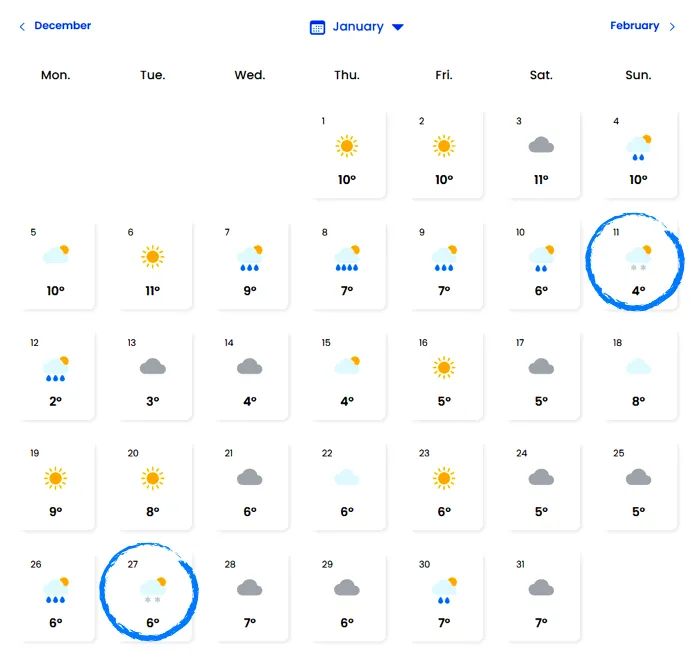 Luna ianuarie 2026 ar putea veni cu ninsori, susțin meteorologii, în anumite zile. Deși în prima parte a lunii se vor înregistra temperaturi ce vor atinge chiar și 11 grade Celsius, meteorologii arată că ninsorile nu vor lipsi. În acest sens, prima ninsoare ar avea loc pe 11 ianuarie 2026, cu o maximă ce nu va depăși 4 grade Celsius. Apoi, mai este așteptată o ninsoare pe 26 ianuarie 2026, iar temperatura maximă nu va depăși 6 grade Celsius. Zilele în care se vor înregistra ploi și ninsori sunt: