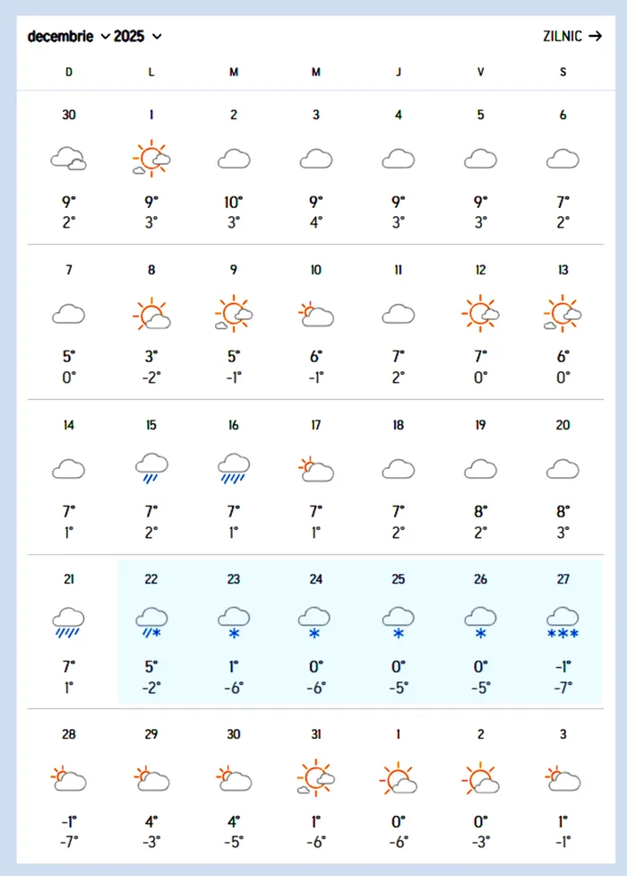 Pe de altă parte, prognoza ANM arată că debutul lunii decembrie va aduce, pentru București, temperaturi de toamnă târzie, cu maxime de 10 grade Celsius. Primele semne de iarnă autentică apar după data de 20 decembrie, când temperaturile coboară brusc sub 0 grade.