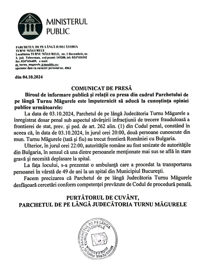 Parchetul de pe lângă Turnu Măgurele a informat că bărbatul împușcat, după ce a încercat să treacă ilegal frontiera cu Bulgaria, și săteanul care îl însoțea sunt tată și fiu și au domiciliul în Turnul Măgurele.
