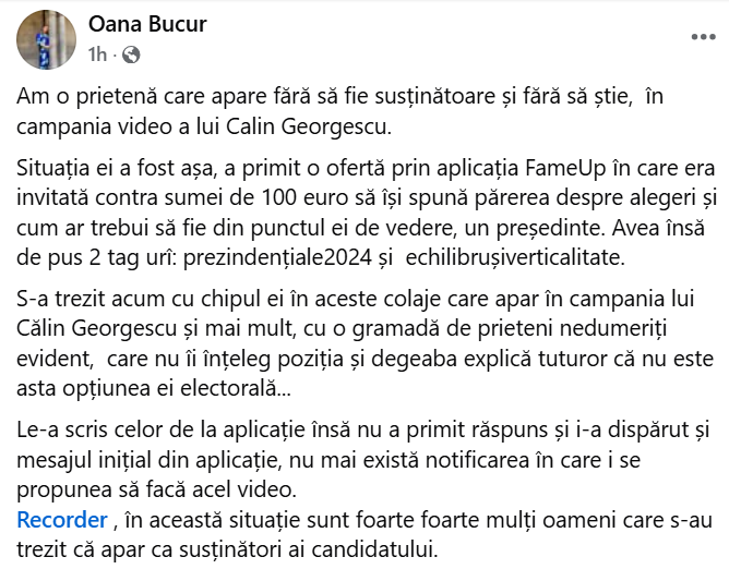 „Am o prietenă care apare fără să fie susținătoare și fără să știe, în campania video a lui Călin Georgescu. Situația ei a fost așa, a primit o ofertă prin aplicația FameUp în care era invitată contra sumei de 100 euro să își spună părerea despre alegeri și cum ar trebui să fie, din punctul ei de vedere, un președinte. Avea însă de pus 2 tag-uri: prezidențiale2024 și echilibrușiverticalitate.