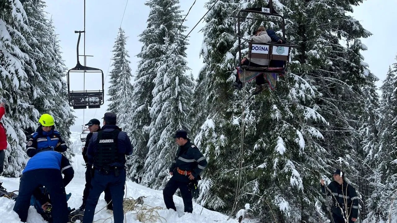 Nouă adulți și un copil au rămas blocați, duminică după-amiază, în telescaunul din Vatra Dornei, în județul Suceava.