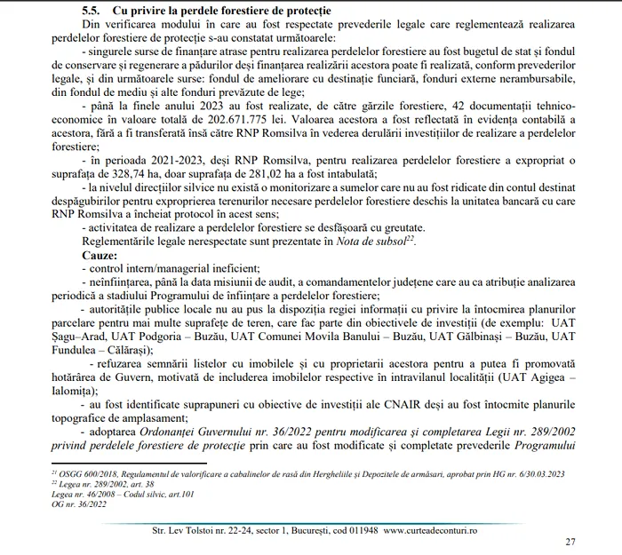 În ceea ce privește proiectul de realizare a perdelelor forestiere, una din marile probleme ale României în lupta împotriva deșertificării și una din cele mai importante revendicări civice ale ultimilor ani, Curtea de Conturi arată că deși suprafața expropriată în acest scop a fost extrem de mică (doar 328 de hectare), nici măcar aceasta n-a fost întabulată.