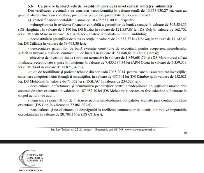 În raportul din iunie Curtea de Conturi arată că s-au constatat neconformități în valoare totală peste 13,35 milioane de lei care au generat abateri financiar contabile (10,4 milioane de lei), precum și prejudicii (aproape 3 milioane de lei) la obiectivele de investiții.
