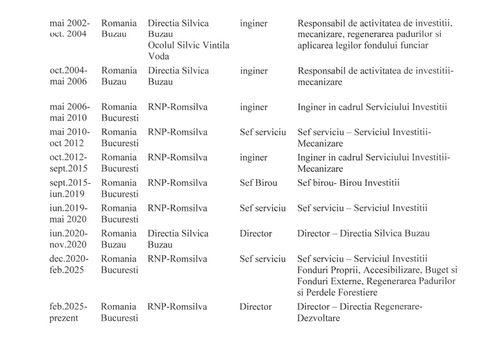 Potrivit CV-ului public al acestuia, el a deținut vreme de un deceniu și jumătate, funcția de conducere în unul din cele mai controversate domenii ale Regiei Naționale a Pădurilor – investițiile