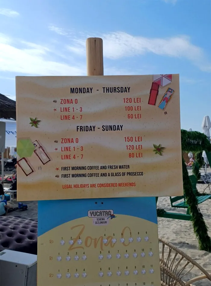 „Costul închirierii unui șezlong variază în funcție de distanța până la apă, respectiv este de 150 lei pentru primul rând de șezlonguri și ajunge la 80 lei pentru ultimele rânduri!