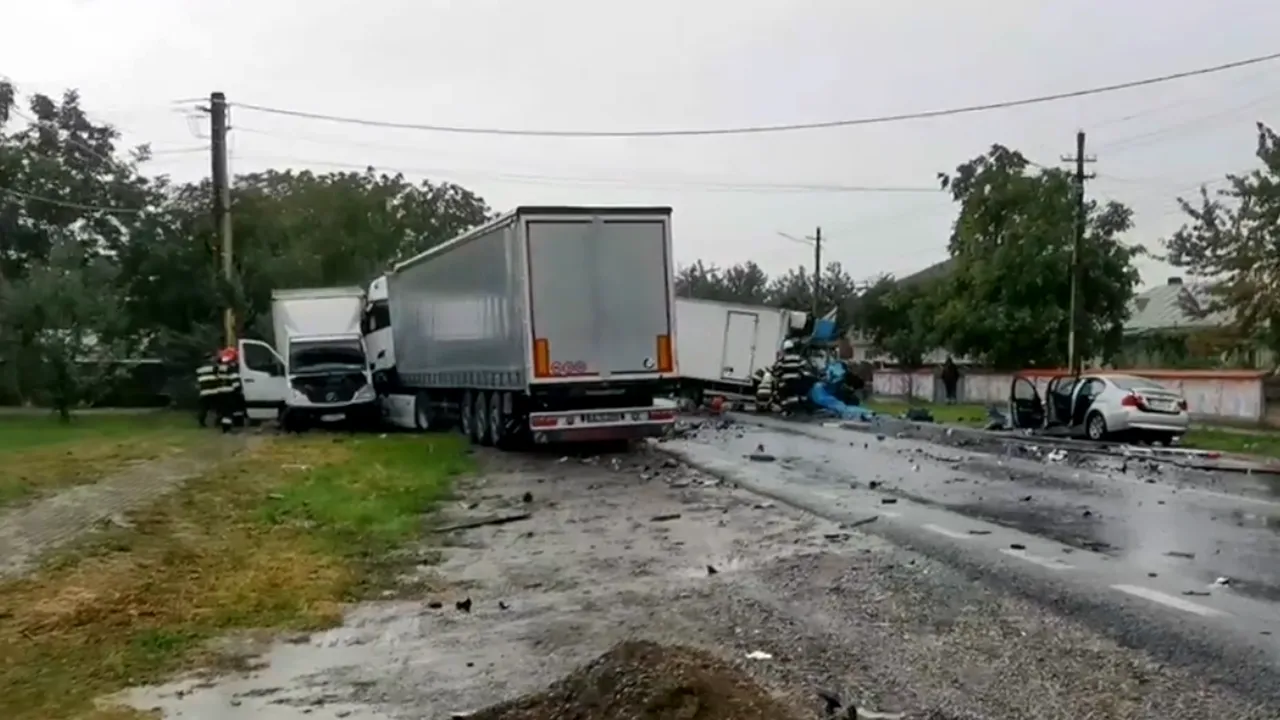 În evenimentul rutier au fost implicate două autoutilitare, un autoturism și un autocamion, iar circulația în zonă a fost blocată. În momentul accidentului, ploua și carosabilul era umed.