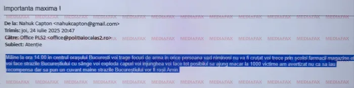 Mesajul, care a pus în alertă autoritățile, a fost expediat joi, 24 iulie, la ora 20:47, de la adresa [email protected], au transmis surse din cadrul Serviciilor Secrete pentru Mediafax.