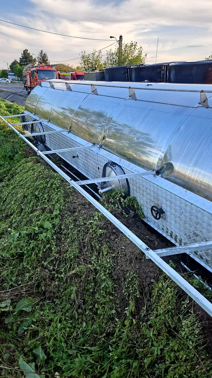Autocisterna este răsturnată pe marginea șoselei și la finalul intervenției va fi ridicată cu ajutorul unor utilaje.