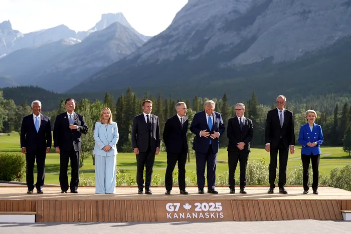 De la stânga la dreapta – Președintele Consiliului European, Antonio Costa, prim-ministrul japonez Shigeru Ishiba, prim-ministrul italian Giorgia Meloni, președintele francez Emmanuel Macron, prim-ministrul canadian Mark Carney, președintele american Donald Trump, prim-ministrul britanic Keir Starmer, cancelarul german Friedrich Merz și președinta Comisiei Europene, Ursula von der Leyen, pozează pentru fotografia de grup în timpul summitului G7 de la Kananaskis, Alberta – luni, 16 iunie 2025 | Foto – Profimedia Images