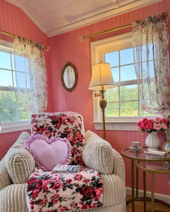 Interiorul este decorat cu accente vintage, flori, fotografii înrămate, plante decorative și o mochetă, piesa centrală fiind un fotoliu roz, foarte confortabil.