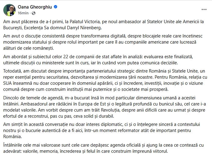 Vicepremierul României a transmis că cei doi au discutat ”consistent” despre transformarea digitală, blocajele care încetinesc modernizarea statului și despre rolul pe care îl au companiile americane care lucrează alături de cele românești. Potrivit comunicatului emis, cei doi au analizat importanța parteneriatului strategic dintre România și Statele Unite. Oana Gheorghiu a transmis că, pentru țara noastră, relația cu SUA nu înseamnă doar cooperare în domeniul apărării, ”ci și încredere, investiții, inovație și o viziune comună despre cum construim instituții mai puternice și o societate mai prosperă”.