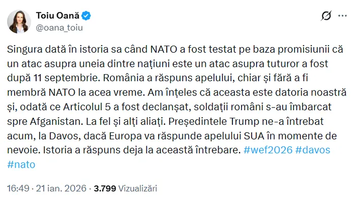 „Singura dată în istoria sa când NATO a fost testat pe baza promisiunii că un atac asupra uneia dintre părți este un atac asupra tuturor a fost după 11 septembrie. România a răspuns apelului, chiar și fără a fi membră NATO la acea vreme. Am înțeles că aceasta este datoria noastră și, odată ce Articolul 5 a fost declanșat, soldații români s-au îmbarcat spre Afganistan. La fel și alți aliați. Președintele Trump ne-a întrebat acum, la Davos, dacă Europa va răspunde apelului SUA în momente de nevoie. Istoria a răspuns deja la această întrebare,” a scris Oana Țoiu pe X