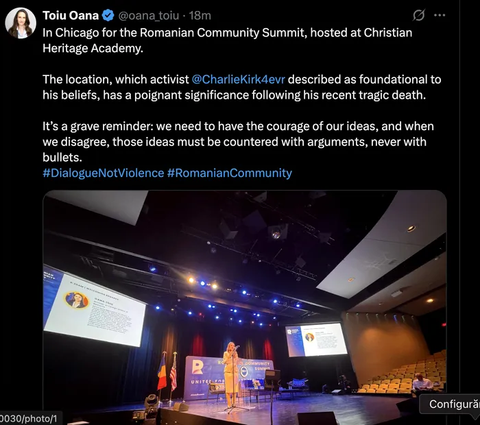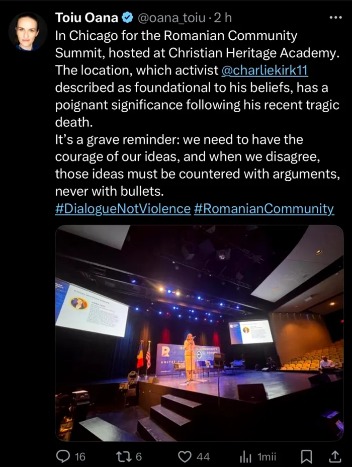 După dezvăluirile Gândul că a ținut un discurs într-o sală goală, ministrul de Externe Oana Țoiu a șters postarea de pe X în care spunea că a participat la Summitul Comunității Românești, în Chicago. În aceeași postare, Țoiu remarca că se află într-o locație pe care Charlie Kirk, activistul politic asasinat în SUA, o considera o fundamentală pentru credințelor sale – Christian Heritage Academy.