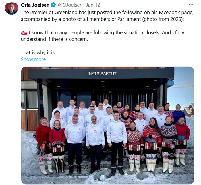 La rândul său, premierul insulei, Orla Joelsen, a postat un mesaj pe contul de Facebook, însoțit de o fotografie cu toți membrii Parlamentului (photo from 2025):