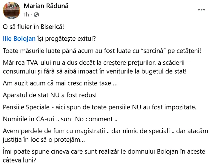 Marian Rădună, activit cunoscut pentru apropierea sa de Nicușor Dan și pentru rolul său de consilier în Ministerul Sănătății pe vremea lui Vlad Voiculescu, lansează un atac frontal la adresa lui Bolojan. Rădună sugerează că în jurul prim-ministrului se conturează „o nouă gașcă” interesată mai mult de putere decât de reforme.