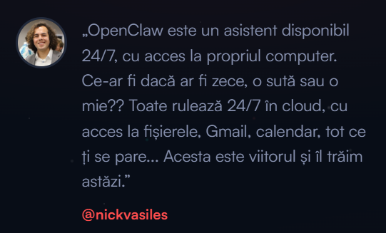 „Înainte de a instala un AI care vă citește e-mailurile, vă gestionează calendarul și are acces la cardul bancar, merită să vă opriți un moment. Din punct de vedere tehnic, oferiți acelui sistem un nivel de acces pe care nu l-ați oferi unui străin. Tehnologia este impresionantă, dar riscurile sunt reale. Vorbim despre pierderi financiare, furt de date și, în unele cazuri, preluarea completă a controlului asupra calculatorului personal. Viitorul asistenților AI este inevitabil, dar trebuie construit responsabil, nu în grabă.”