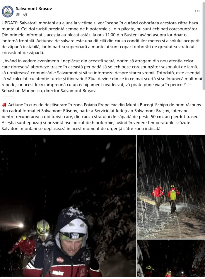 „Având în vedere evenimentul neplăcut din această seară, dorim să atragem din nou atenția celor care doresc să abordeze trasee în această perioadă să se echipeze corespunzător sezonului de iarnă, să urmărească comunicările Salvamont și să se informeze despre starea vremii. Totodată, este esențial să vă calculați cu atenție turele și itinerariul! Ziua devine din ce în ce mai scurtă și se întunecă mult mai repede, iar acest lucru, împreună cu un echipament neadecvat, vă poate pune viața în pericol!”, a declarat Sebastian Marinescu, director Salvamont Brașov.