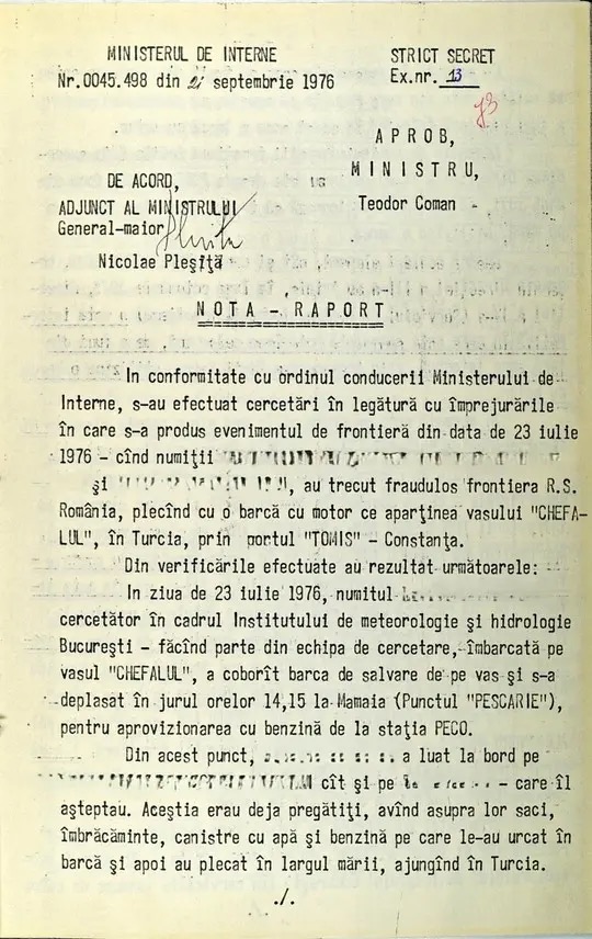 Pe 23 iulie 1976, patru cetățeni români au reușit să plece spre Turcia cu o barcă cu motor, pornind din Constanța. Operațiunea a fost posibilă grație unei nave de cercetare marine, „Chefalul”, folosită de Institutul de Meteorologie și Hidrologie București.