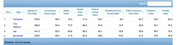 Orașele din România care oferă cel mai bun echilibru între venituri, costuri și confort sunt Timișoara, Cluj-Napoca și Iași. Bucureștiul, deși are cele mai mari salarii și cele mai multe joburi, se află abia la coada clasamentului în ceea ce privește calitatea vieții.