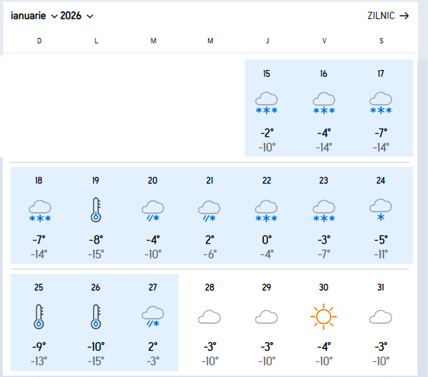 • Sâmbătă, 17 ianuarie 2026: ninge. Temperatura maximă de -7 grade Celsius, temperatură minimă de -14 grade Celsius.