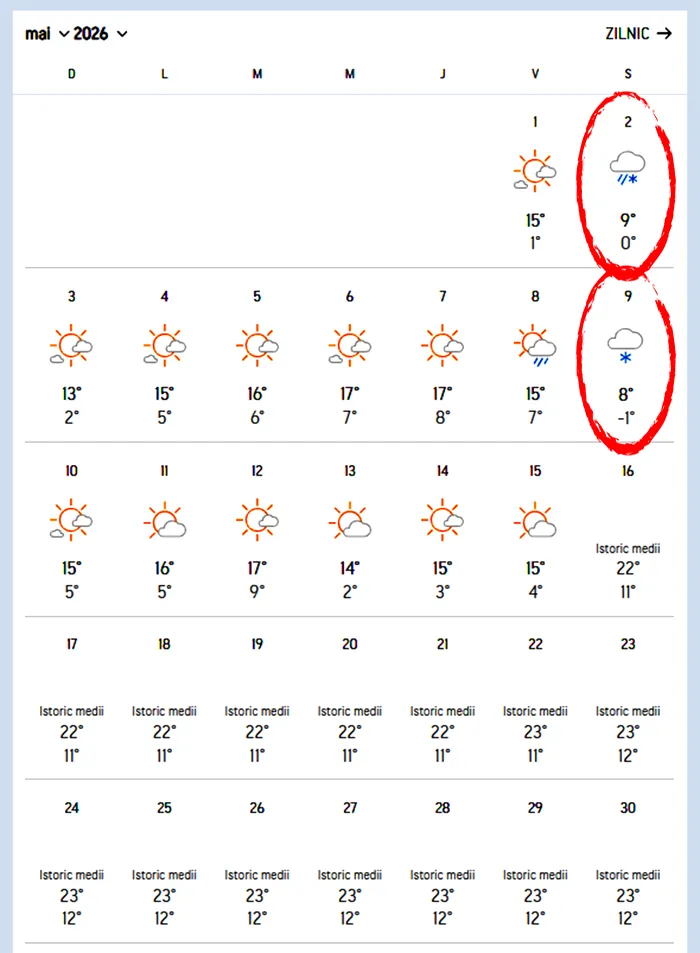 Accuweather arată că nici începutul lunii mai nu va aduce vreme stabilă la munte. Prognoza disponibilă până la 15 mai indică în Predeal noi episoade de precipitații sub formă de ninsoare sau lapoviță. Este posibil să avem zăpadă în primele zile ale lunii mai și în jurul datei de 9, când temperaturile nocturne vor coborî spre -1 grad Celsius.