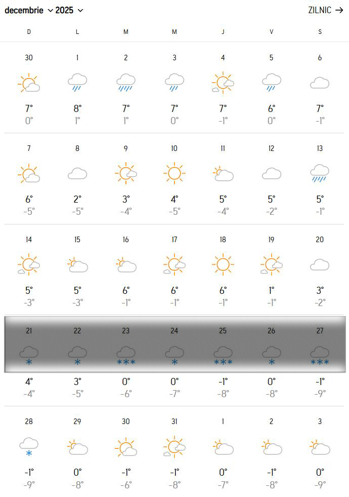 În Brașov, ninsorile își vor face simțită prezența începând cu 22 decembrie, până pe 31 decembrie, ultima zi din an.