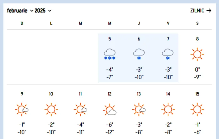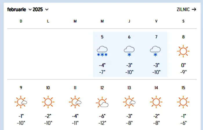 Și în Predeal avem aceeași prognoză, inclusiv temperaturile pentru aceste trei zile sunt asemănătoare. Va ninge semnificativ miercuri, plus ceva fulgi așteptați și în zilele de joi și vineri, 7 februarie.ț
