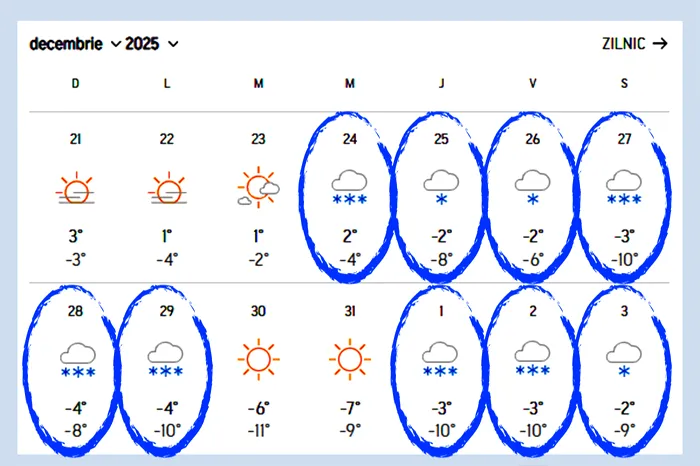 Vor urma apoi două zile cu soare, dar vremea rece va reveni în 1 ianuarie 2026, cu -3/-10 grade, ninsorile continuând și în 2-3 ianuarie, potrivit meteorologilor Accuweather.