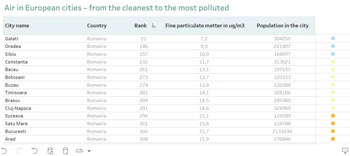 De asemenea, Brașov ocupă poziția 289 (14.5), Cluj Napoca-291 (14,6), în timp ce București este pe locul 302 (15.7). Cele mai poluate orașe din țară sunt Piatra Neamț – locul 329 (17.3), Târgu Mureș – locul 330 (17,5) și Iașiul este cel mai poluat, fiind situat pe locul 340 (18.5).