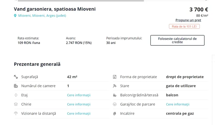 Însă există și oferte care par de neratat. Este și cazul unei garsoniere de 42 de metri pătrați din Mioveni, județul Argeș, scoasă la vânzare pe un site specializat pentru suma modică de 3.700 de euro.