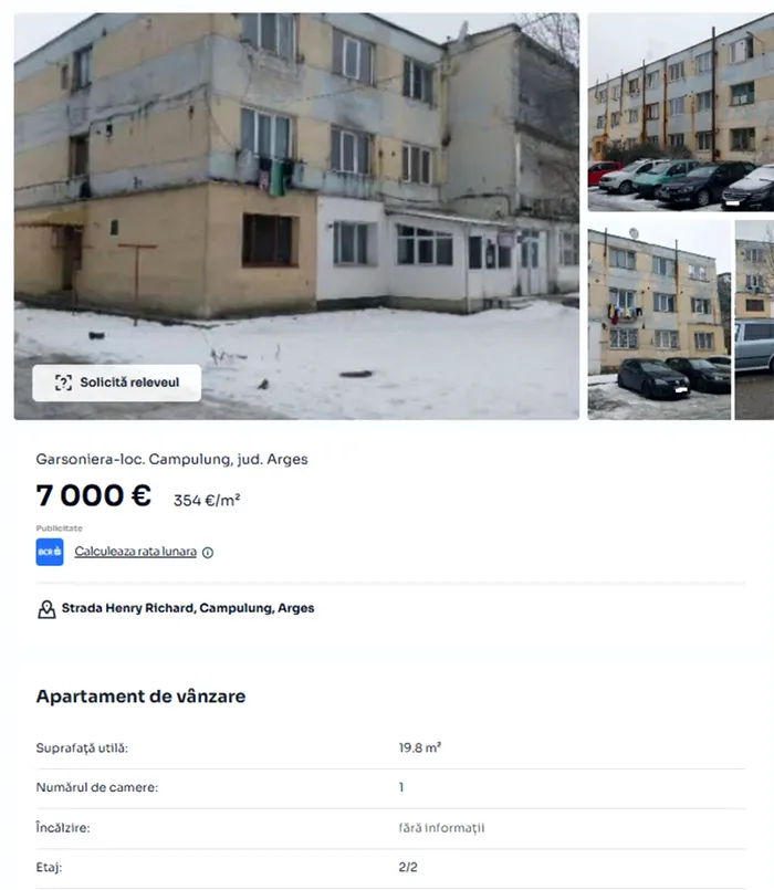 Într-un oraș din România se vinde o garsonieră cu 7.000 de euro, acum, în luna martie 2026, conform unui anunț postat pe un site comercial de imobiliare.