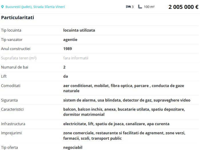 Orașul din România în care un apartament cu 3 camere costă 2.005.000 de euro este… București. Locuința se află la etajul 4/8 și este situată în zona Piața Unirii, pe strada Sf. Vineri, în spatele Tribunalului Bucuresti. Blocul a fost construit în anul 1989 și este reabilitat, având și lift nou.