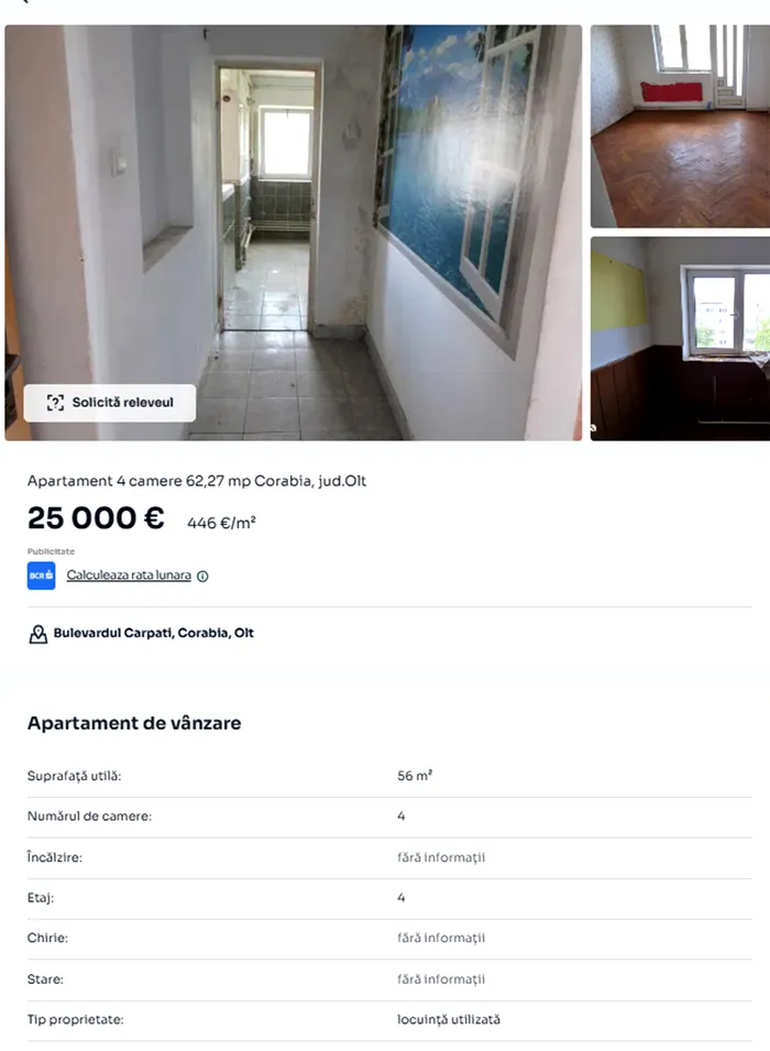 Totuși, prețul scăzut vine și cu un cost ascuns: apartamentul necesită renovare completă, inclusiv intervenții la terasa blocului în zona aferentă locuinței. Cu toate acestea, pentru cei dispuși să investească ulterior, oferta poate reprezenta o oportunitate rară pe piața imobiliară din România.