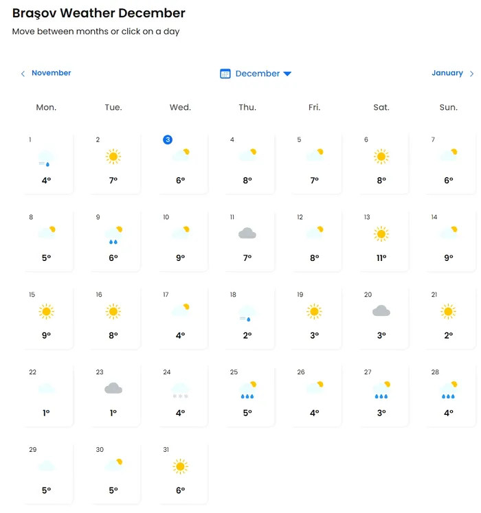 În general, temperatura în Brașov la începutul lunii decembrie este de 6,6 grade Celsius.