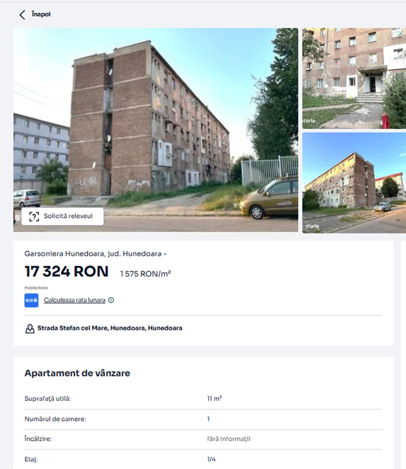 Deși prețul locuințelor din România crește constant, există și oportunități de neratat. Nu numai în micile orașe de provincie, în special cele fost industriale, dar și în reședințele de județ puteți achiziționa o locuință cu doar două, trei salarii lunare decente. În acest caz, în Hunedoara, o garsonieră se vinde cu doar 3.400 euro. Dar spațiul nu este tocmai generos…