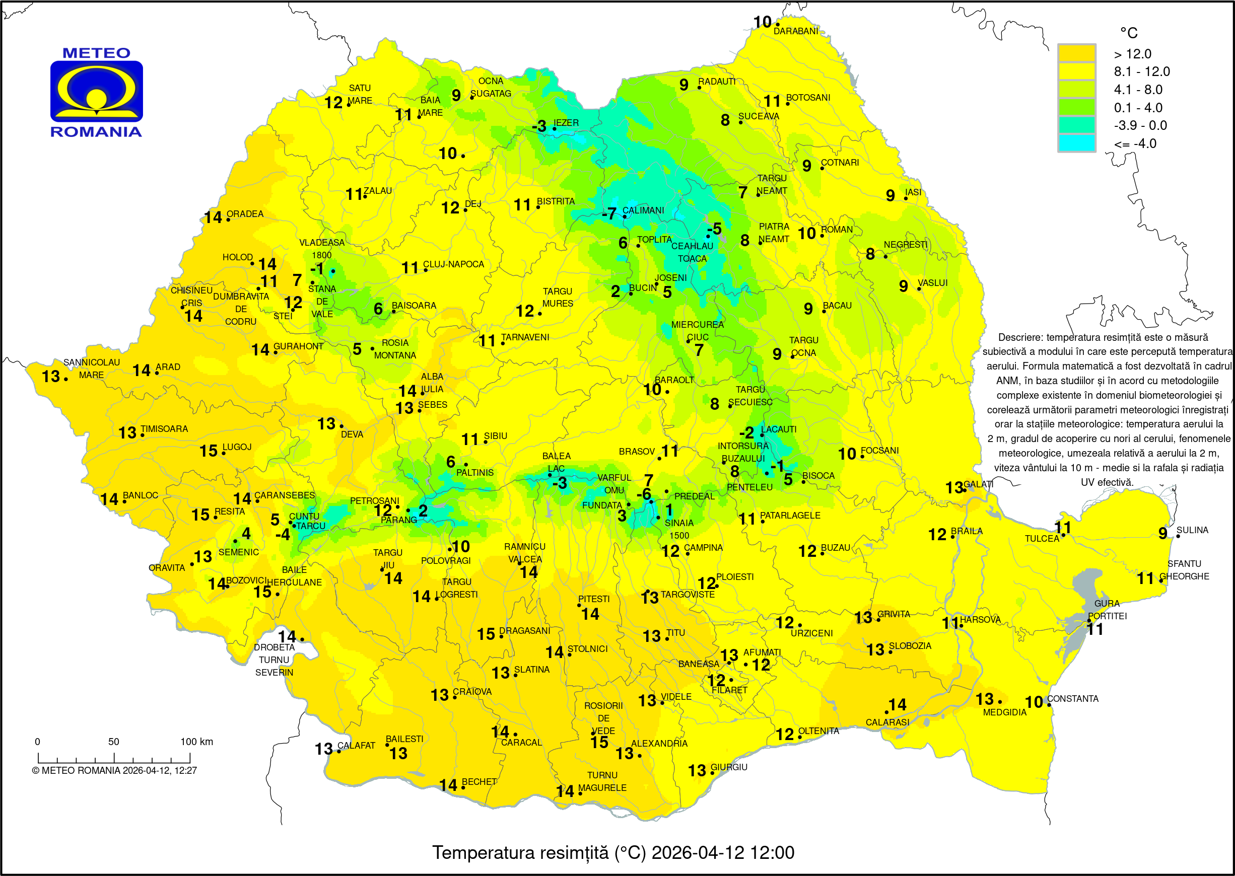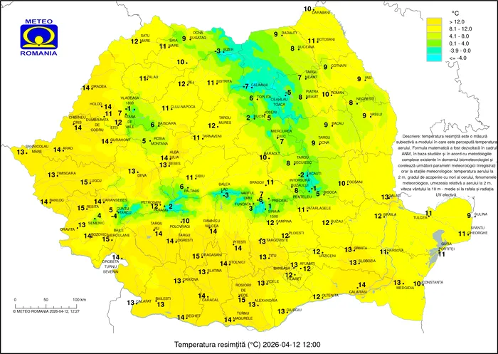 Temperaturile cresc față de zilele trecute, însă rămân mai mici decât ar fi normal pentru această perioadă. Cele mai ridicate valori, de 17 grade, apar în Oltenia și Banat, în timp ce în Transilvania maximele nu trec de 9 grade. Cerul prezintă nori în majoritatea regiunilor, iar în estul și sud-estul țării cad ploi slabe. Nopțile rămân foarte reci, cu temperaturi care coboară până la -6 grade în depresiuni și ating 8 grade în vestul țării.