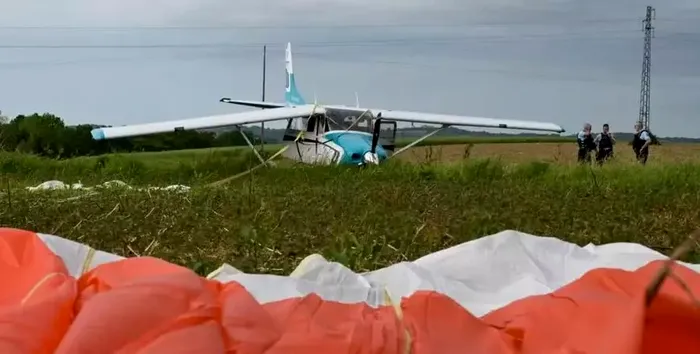 Aterizarea a fost însă dură, iar parașuta a rămas agățată în cablurile de înaltă tensiune din zonă.